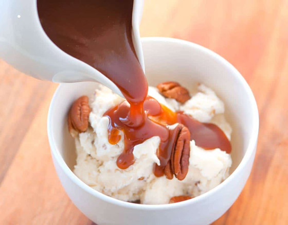6. عند التقديم، أخرجوا صينية الآيس كريم من الفريزر، واستخدموا ملعقة الآيس كريم للسكب، ويُقدم بارداً في أكواب مع صوص التوفي للتزيين على الوجه بحسب الرغبة.