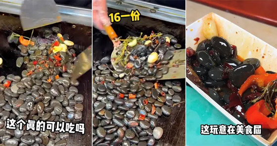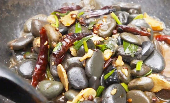 تم تناقل الطبق التقليدي عبر عدة أجيال، واليوم يمكن رؤية الباعة على جانب الطريق في الصين يحرقون مجموعات من صخور النهر بزيت الفلفل وصلصة الثوم وفصوص الثوم ومزيج من التوابل. خلال الشهور الأخيرة انتشرت العديد من مقاطع الفيديو على مواقع التواصل الاجتماعي، تُظهر طريقة طهي هذه الأكلة التي تعتبر الأغرب في العالم، والتي وصل بعضها إلى ملايين المشاهدات. يبلغ سعر الوجبة الواحدة في الصين قرابة دولارين ونصف، وهو ما يعتبر ثمناً باهظاً في حال الانتباه إلى أنها تكاد لا تحتوي على أي مواد صالحة للأكل سوى التوابل.