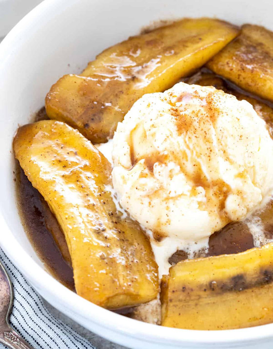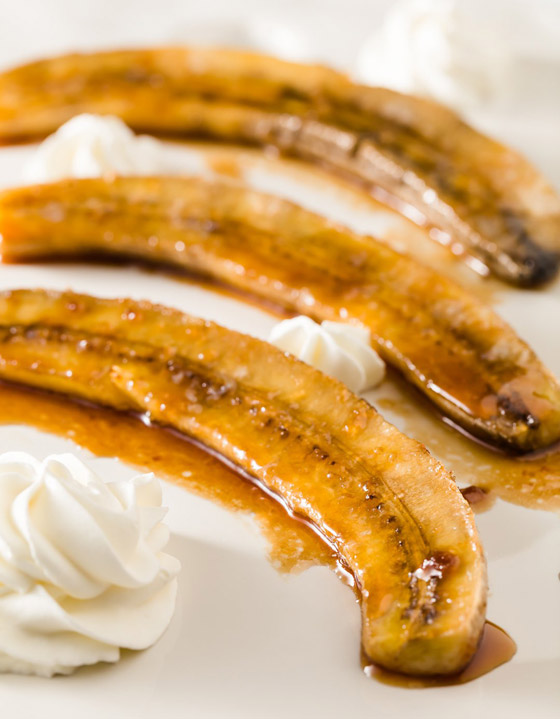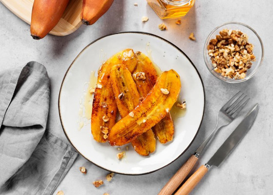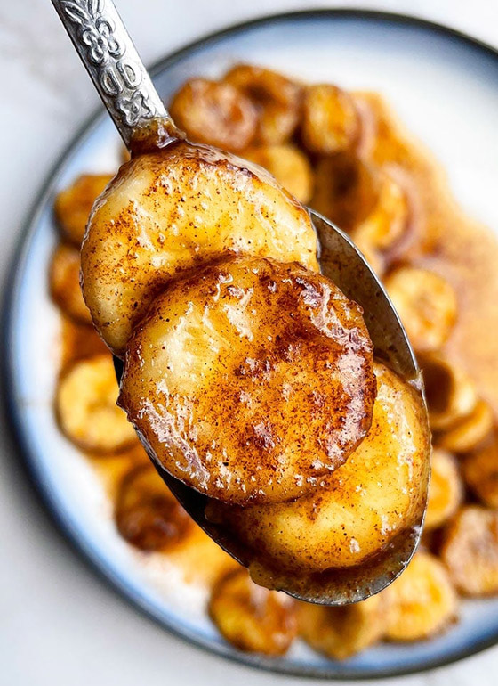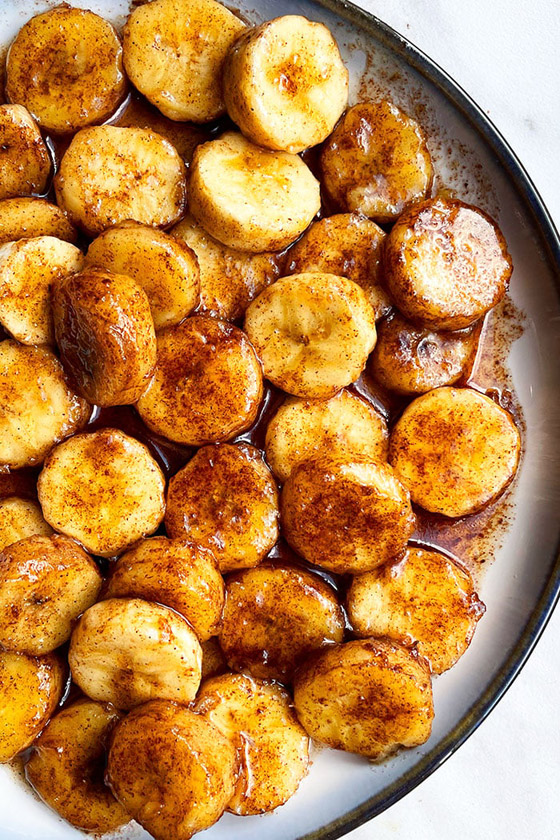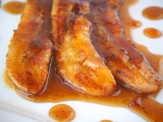 3. أضيفوا شرائح الموز وقلبوها من كلا الجهتين حتى تتكرمل، ثم ضعوها في طبق التقديم وقدموها.
