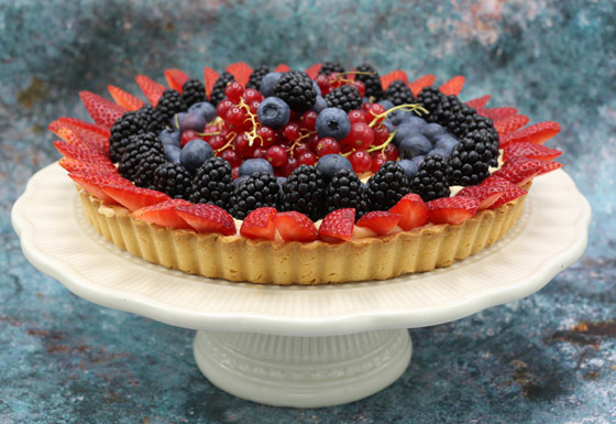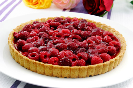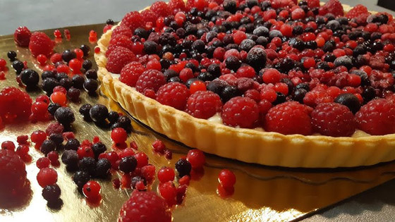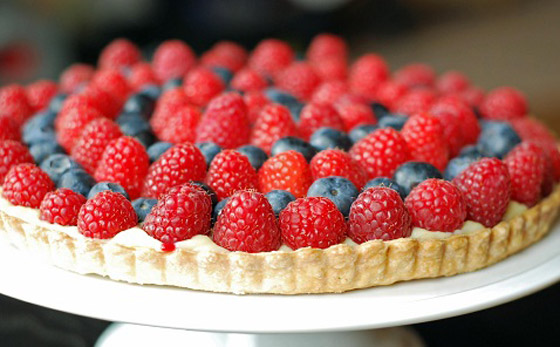 • تخرج من الفرن وتترك لتبرد وتسكب عليها الكريمة وتزين بالفواكه الحمراء.