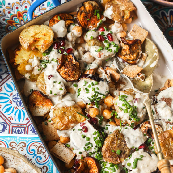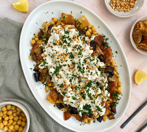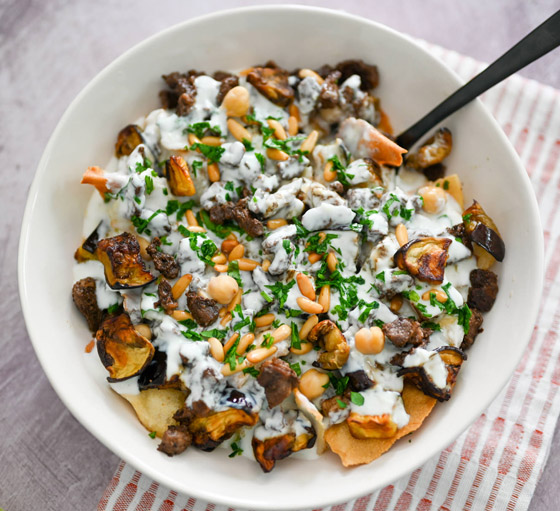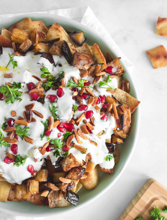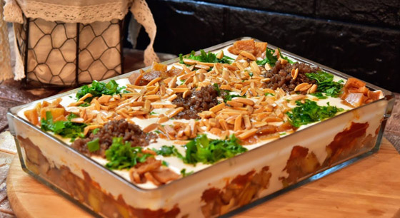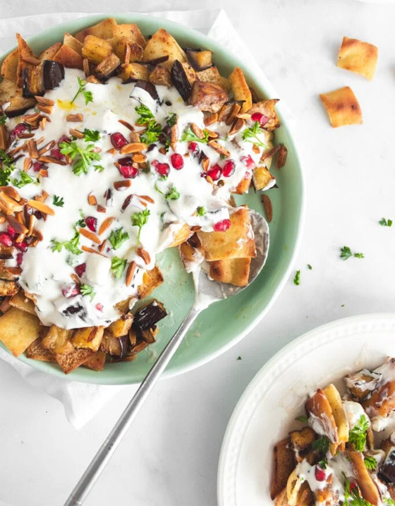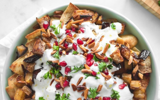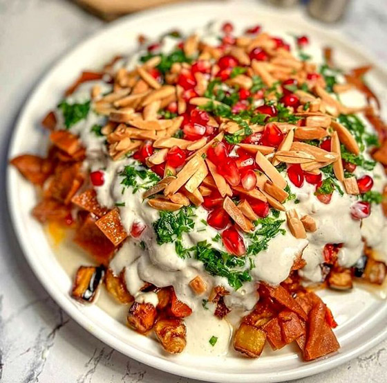 وبهذه الطريقة، يصبح طبق فتة الباذنجان باللبن والطحينة جاهزاً للأكل.