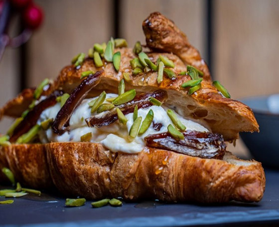 2. نقوم بوضع الحشو داخل حبات الكروسان، ونغمسها بالفستق الحلبي المبشور.