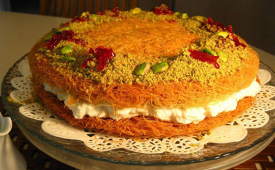 5. ثمَّ، يُضاف النصف الآخر من شعيرات الكنافة فوق الحشو في الصينيَّة. وتوضع هذه الأخيرة بالفرن، لخمس وثلاثين دقيقة، حتَّى تصبح ذهبيَّة اللون.
