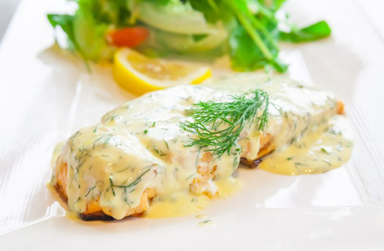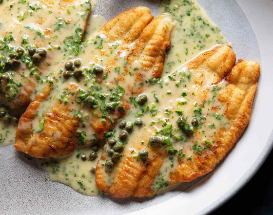 6. للتقديم: ضعوا البطاطس المسلوقة والمتبلة في طبق التقديم، ثم ضعوا إلى جانبها السمك المقلي، وصبوا فوقه صوص الزبدة، وقدموه.