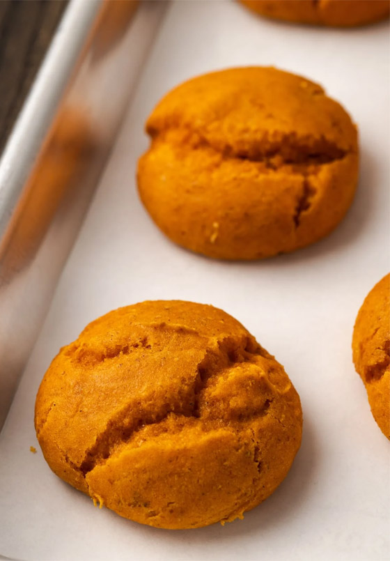 5. ضعوا كرات من مزيج كوكيز القرع في صينية فرن غير مدهونة وذلك باستخدام ملعقة مع تسطيح الكرات قليلاً بظهر الملعقة.
