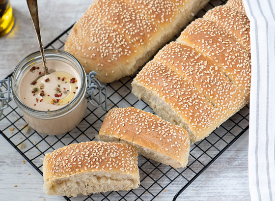 خبز توست بالزعتر والسمسم... أعدوا وصفة خفيفة وطيبة المذاق ستنال إعجاب جميع أفراد الأسرة، جربوا شرائح خبز التوست المنزلي بطعم الزعتر الجاف والسمسم المحمص مع زيت الزيتون، وصفة مخبوزات طيبة مع كوب من الشاي الساخن، جربوها الآن. وقت الطهي: 60 دقيقة.. يكفي ل: 6 أشخاص.