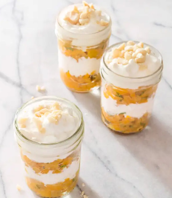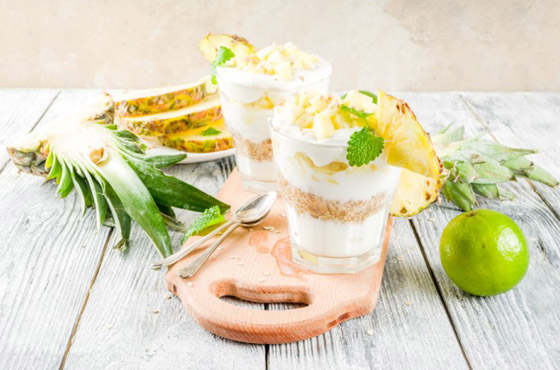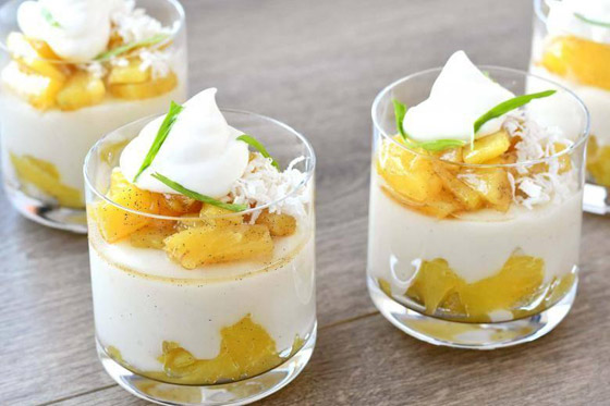 5. وزعوا الكريمة على وجه الحلى في الطبق وزينوها بقطع الأناناس، ثم قدموها.