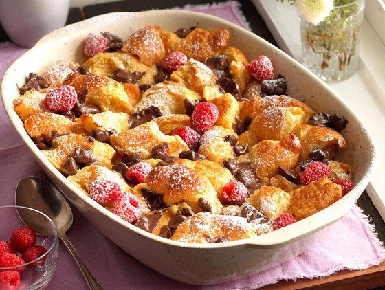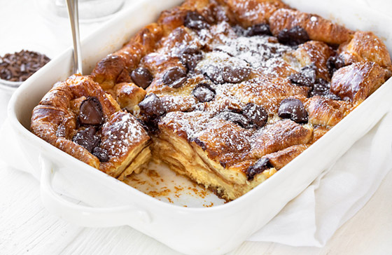 بودينغ الكرواسون بالشوكولاتة والكاسترد... إن توفر لديكم بعض حبات من الكرواسون وأحببتم إعداد وصفة حلى جديدة وغنية منه، سنعرفكم على طريقة عمل حلى البودينغ الرائع بالكرواسون السادة، مع الشوكولاتة اللذيذة والكاسترد، وصفة مميزة سيعشقها أطفالكم، جربوها وشاركونا رأيكم بالمذاق الطيب. وقت الطهي: 30 دقيقة.. يكفي ل: 3 أشخاص.