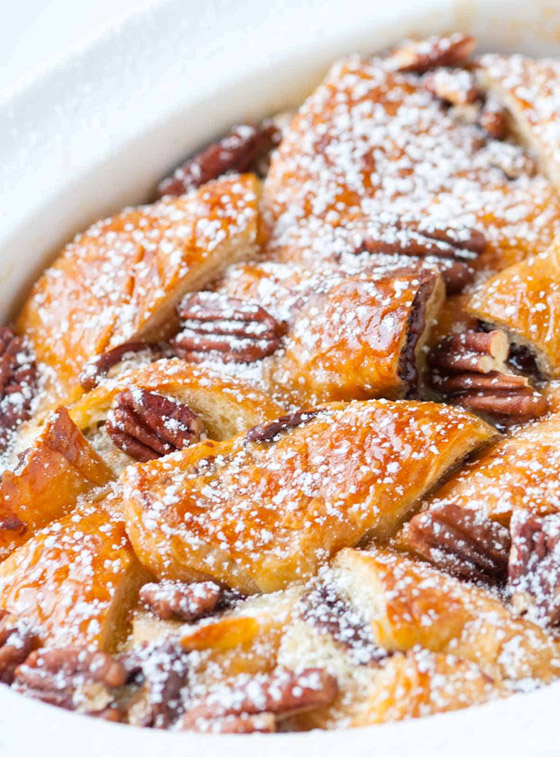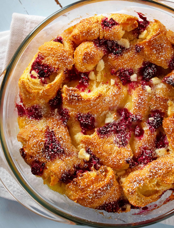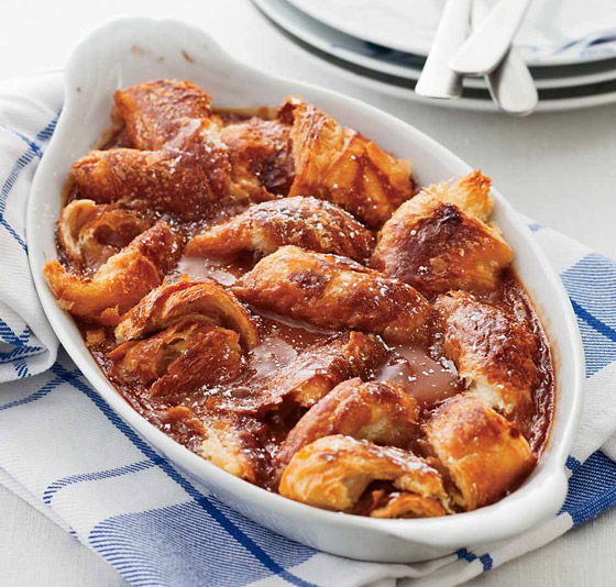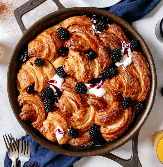 2. في وعاء تقديم يصلح للفرن، ضعوا الكرواسون المحمص، واسكبوا الكاسترد فوقه.