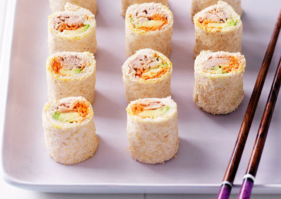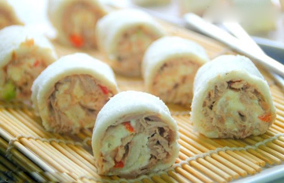 3. احشوا شرائح التوست بالتونة ثم لفوها على شكل رول.