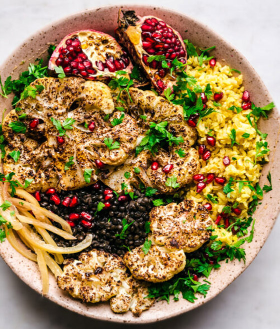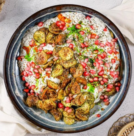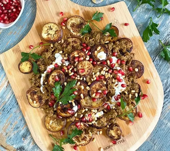 3. أضيفوا كمية الكوسا المتبقية على الوجه، ثم زينوا بحبات الرمان، وزيت الزيتون، ورشة الفلفل الأحمر، وقدموها فوراً.