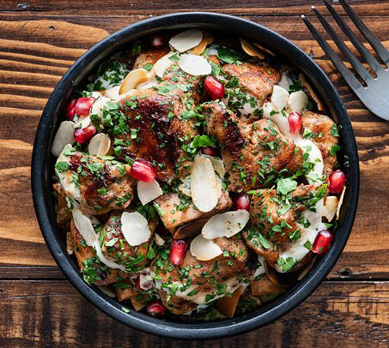 1. في وعاء صغير، اخلطوا الزبادي مع الطحينة، وعصير الليمون، والثوم، والملح، والنعناع الجاف، واتركوه جانباً.