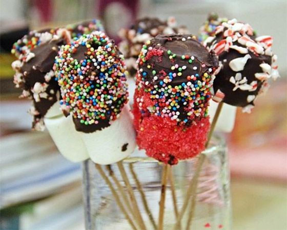 3- تغمس قطع المارشميلو في الشوكولاتة، ثم ترش بقطع الحلوى المقطعة باليد على صحن جانبي.