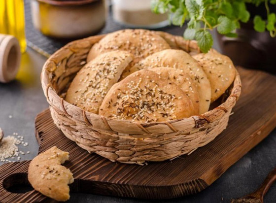 1. نخلّوا الدقيق وضعوه في وعاء، ثم أضيفوا الملح، والكمون المطحون، والبيكنج باودر، واخلطوا جيداً.