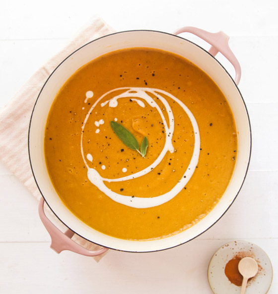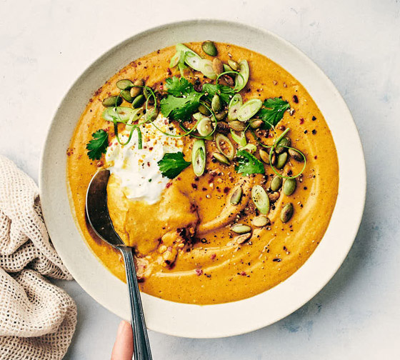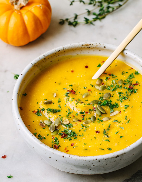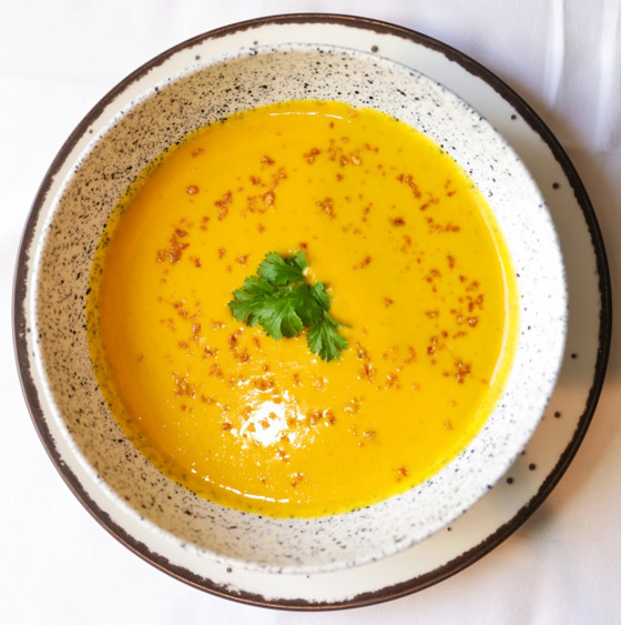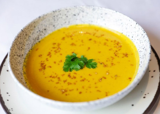 4. يُغلى المزيج ثم تخفف الحرارة، ويغطى ويُطهى على نار هادئة لمدة 25 دقيقة أو حتى ينضج العدس والقرع. تخفق الشوربة بالخلاط كهربائي حتى تصبح ناعمة، ثم تبهر حسب الرغبة.