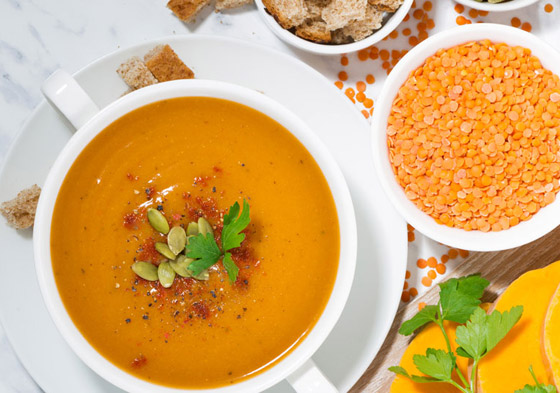 شوربة العدس والقرع لإفطار رمضان... إن بدء الطعام بطبق من الشوربة على إفطار رمضان الكريم، يليّن المعدة ويدفئها بعد نهار طويل، ويبعدها كذلك عن كل انزعاج أو مغص، جربوا معنا هذه الوصفة المميزة بمكوناتها والتي تجمع طبقين في طبق واحد. وقت الطهي: 30 دقيقة.. يكفي ل: 2 أشخاص.