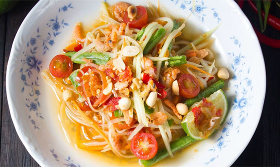 تأتي هذه السلطة الحارة من مقاطعة إيسان المحبّة للتوابل شمال شرق تايلاند، وهي طبق أساسي في المطاعم التايلاندية حول العالم، وتحظى بشعبية كبيرة أيضًا في لاوس المجاورة. وتشكل فاكهة البابايا الخضراء غير الناضجة، والتي تُقطَّع إلى شرائح رفيعة عادةً، المكون الرئيسي للطبق. وبعد ذلك تتم إضافة الفاصوليا الخضراء الطويلة، ومزيج من المكونات الآسيوية الرئيسية اللذيذة، مثل عصير التمر الهندي، والروبيان المجفف، وصلصة السمك، ومعجون قصب السكر. ويمنح الفلفل الحار التايلاندي السلطة النكهة المطلوبة.