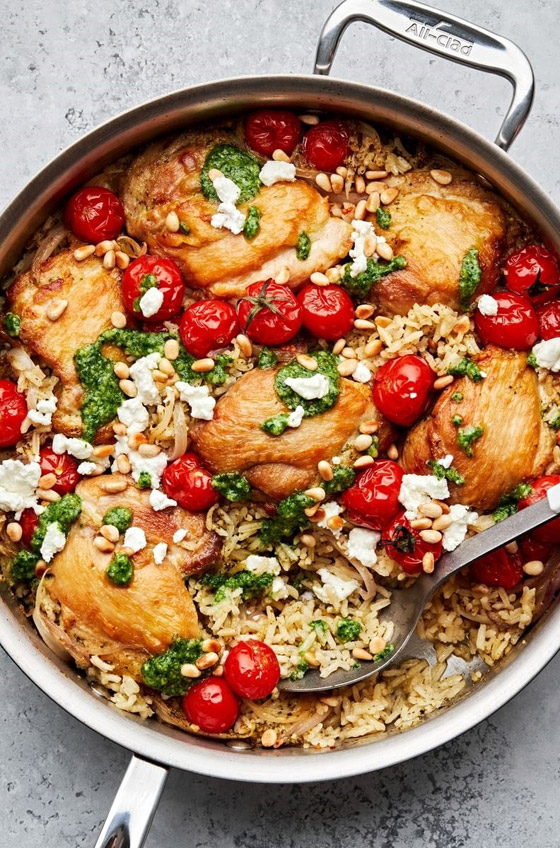 أرز وأفخاذ دجاج وصلصة البيستو وطماطم كرزية ومرق دجاج وعصير ليمون حامض وبرش الحامض وملح وبصل أحمر مقطع.