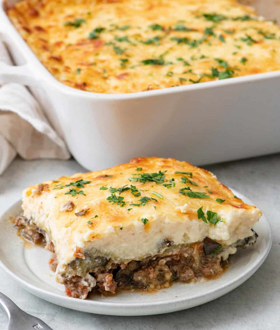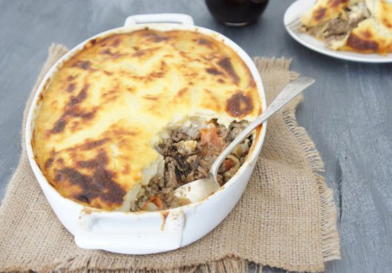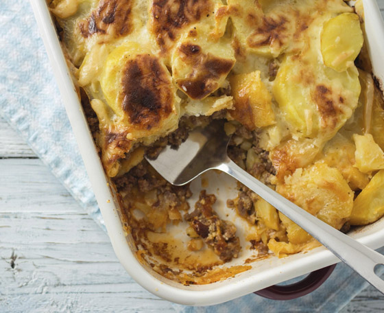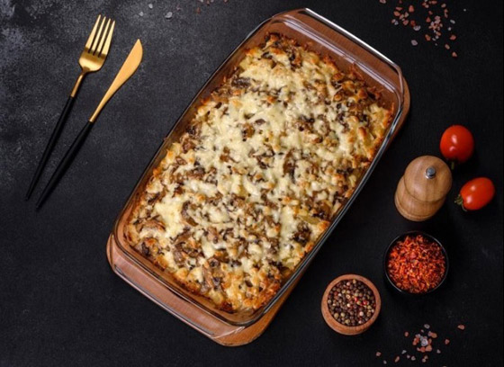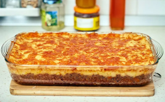 9. حضّروا طبق بايركس وادهنوه بالزبدة، ثم وزعوا خليط اللحم في القاع، وفوقه طبقة من البطاطس المهروسة، ثم صبّوا البشاميل فوق طبقة البطاطس بالتساوي.
