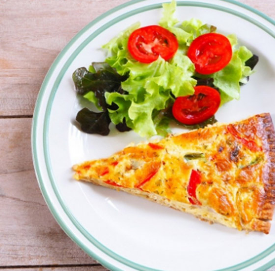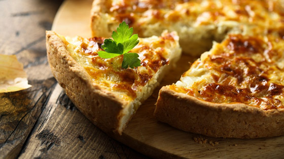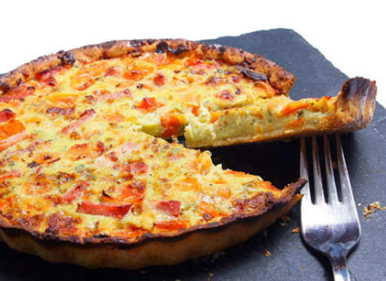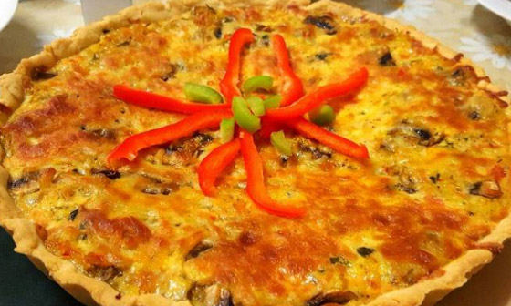 - ينثر قليل من الجبن مباشرة على العجينة، ثم تضاف الحشوة والطماطم ويصب الكريم المخفوق فوق الخضار، وينثر باقي الجبن ويخبز مدة 25-30 دقيقة.