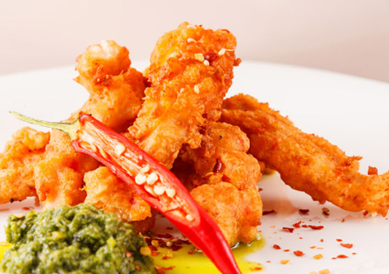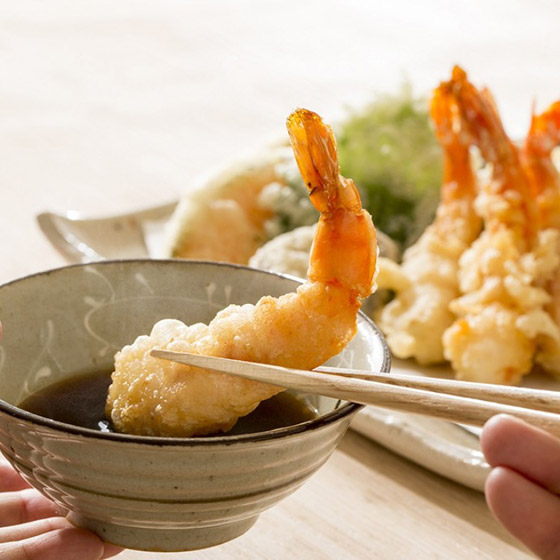 تغمس كل حبة من الروبيان داخل كوب من نشاء الذرة ثم في التمبورا، وتقلى بالزيت الساخن مدة دقيقتين أو حتى تصبح ذهبية اللون.