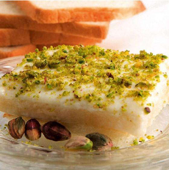 يوضع الخبز القالب مع الضغط عليه ثم تضاف القشدة المخفوقة.