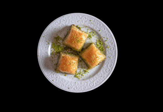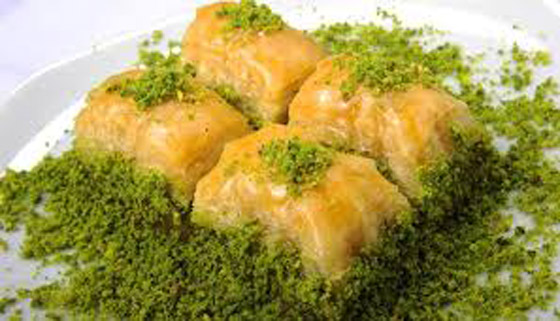 - يرش الفستق المطحون فوقها للزينة، وبعدها عسل التمر.