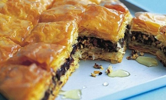 - تقطع العجينة إلى 10 طبقات رقيقة، وتدهن كل طبقة بالزبدة وتوضع فوق بعضها البعض.