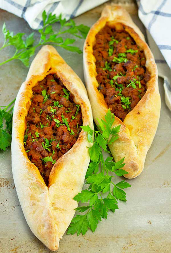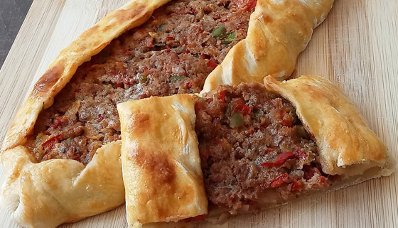 6. شكلوا قطع العجين لكرات متساوية، وكل كرة عجين افردوها بشكل طولي واحشوها بخليط اللحمة وأغلقوها من كل الأطراف، وصفوهم بصينية فرن على ورق زبدة، وأدخلوها الفرن لتتحمر وتنضج، ثم قدموها على الفور.