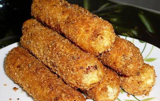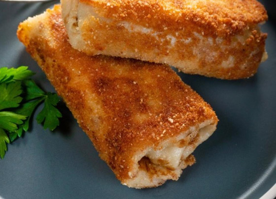 7. غمّسوا رولات التوست المحشية بالجبنة والفلفل الأخضر في وعاء البيض، ومرروها في وعاء البقسماط.