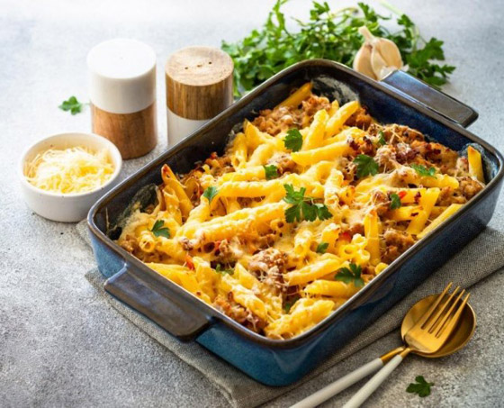 1. اسلقوا المعكرونة بحسب التعليمات المدونة على العبوة مع مراعاة عدم تسويتها بشكل كامل بحيث سيتم تكملة الاستواء في الفرن لتحافظ على قوامها.