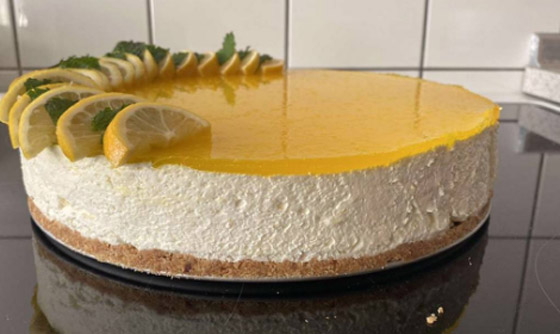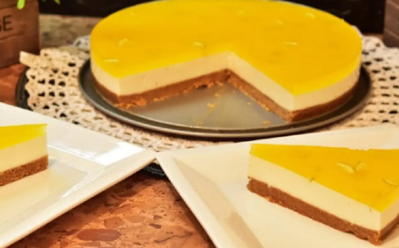 - لتحضير حشوة الكريمة، يخفق الجبن مع الكريمة والقشدة بالخلاط لمدة دقيقتين، ثم يضاف الحليب المكثف المُحلى وبرش الليمون مع الخفق لدقيقتين، ثم يضاف الجيلاتين. تسكب الحشوة فوق طبقة البسكويت، وتعاد إلى الثلاجة حتى تتماسك.