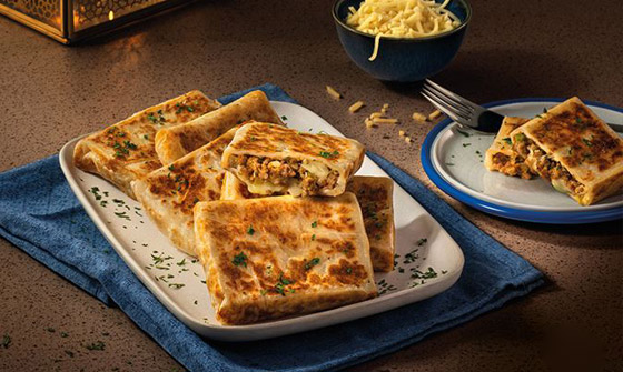 10. احشوا عجينة المطبق المفرودة بالحشوة من المنتصف، واثنوا الأطراف للداخل حتى تصبح العجينة مربعة الشكل ومحكمة الإغلاق.