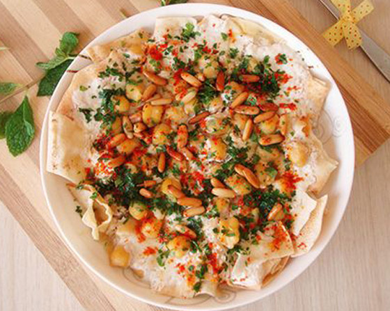 4. صبّوا مزيج الزبادي فوق الخبز المفتت بالتساوي، ثم زيّنوا الفتّة بالصنوبر المحمّص، والكمون، والفلفل الأحمر الحار، وقدموها.