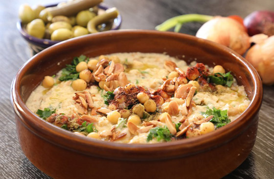 3. ضعوا الحمّص في طبق التقديم، ثمّ وزعوا فوقه الخبز المفتت.
