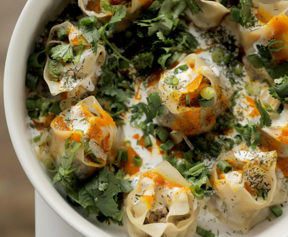 4. اخلطوا القشطة مع الجبن الكريمي، ووزعوا المزيج فوق المنتو.