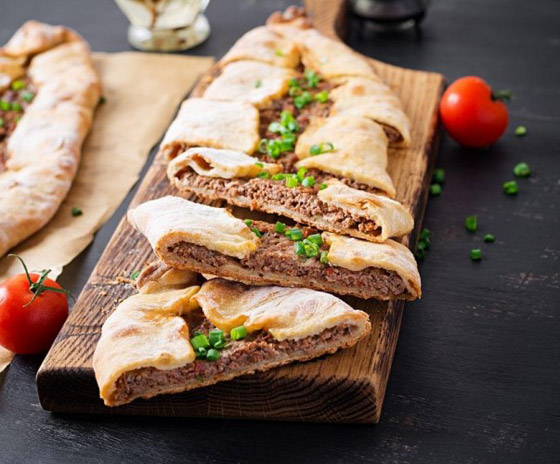 6. افردوا العجينة على سطح العمل، وقطعوها إلى دوائر متساوية الحجم، ثم احشوا كل دائرة بمقدار ملعقة كبيرة من حشوة اللحم، وشكلوها على شكل مربع.