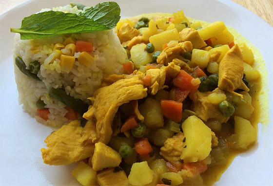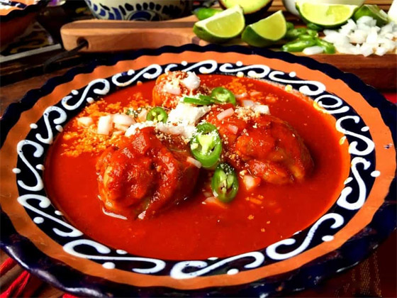 هذا الحساء المكون من دجاج محمص بسيط لكنه لذيذ، حيث يحصل على نكهته الحارة من فلفل جواليو المجفف وفلفل دي أربول الأحمر، بالإضافة إلى الإبازوت، العشب القوي ذو النكهة المميزة.