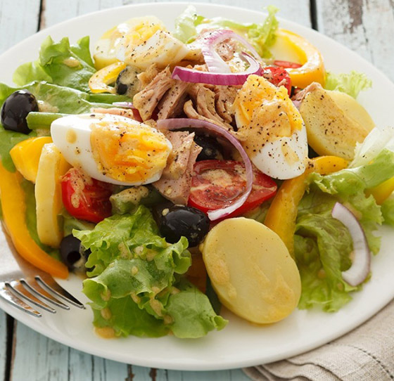 11- وللانتهاء من السلطة، يتمّ سحق حبات الزيتون ووضعها فوق الخضار المتبقية، ثم تُقطع البيضة إلى نصفين وتُقدّم فوقها.