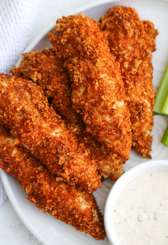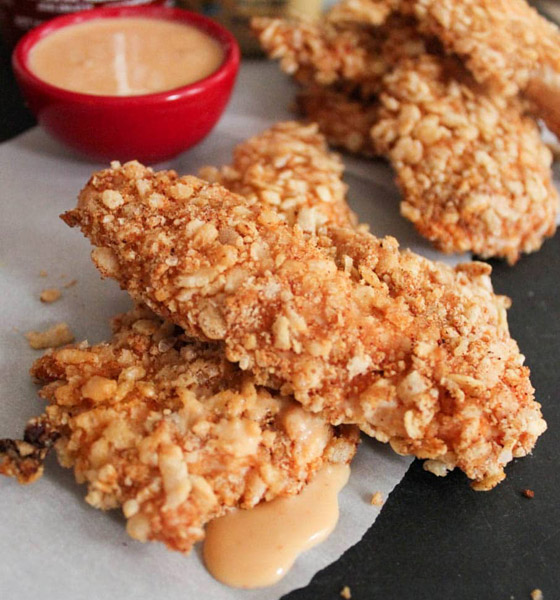 1. قطعوا صدور الدجاج على شكل أصابع طويلة وسميكة.