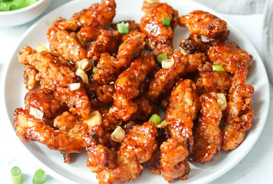 6. اقلوا الدجاج في الزيت الغزير والساخن حتى ينضج ويتحمر، ثم صفوه جيداً وقدموه ساخناً.