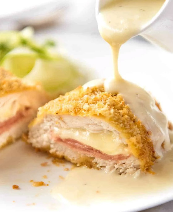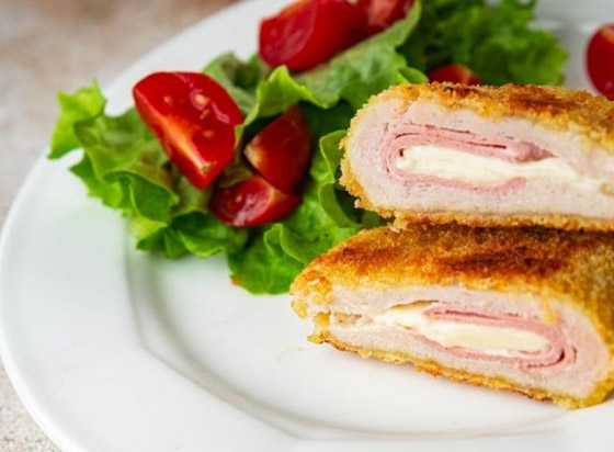6. غلّفوا كل قطعة كوردون بلو بالدقيق، ثم غمسوها بخليط البيض، وأخيراً بالبقسماط.
