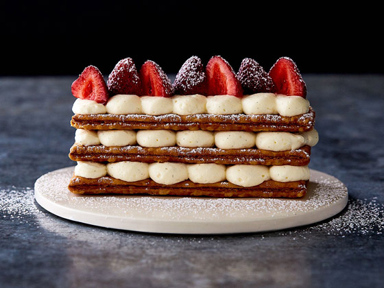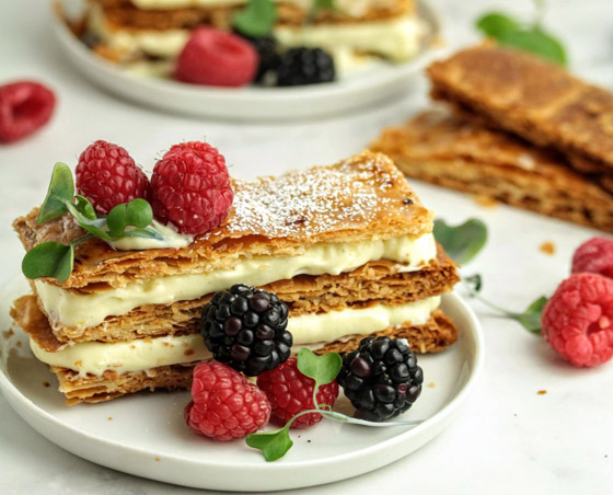 11. نحضر مستطيلاً من الميل فاي ونضع كمية من الكريمة عليه، ونكرر بثلاث طبقات فوق بعضها البعض ويُزين بالسكر الناعم البودرة، ويُقدم الحلى فوراً.