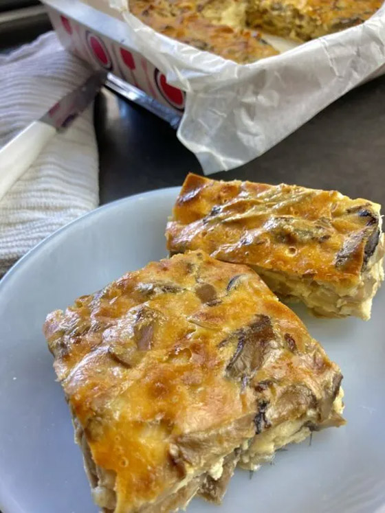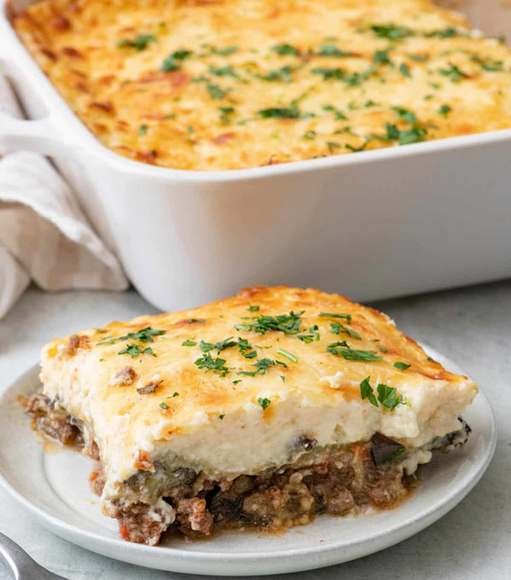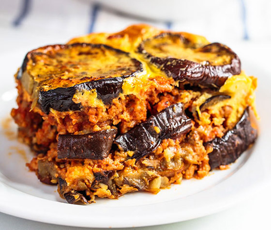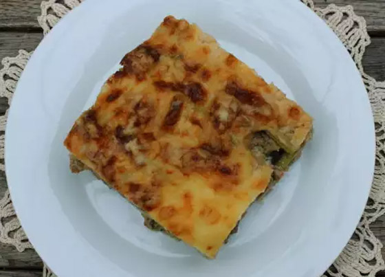 5. ضعوا طبقة من الباذنجان والفلفل الرومي في صينية فرن، وأضيفوا طبقة من اللحم المفروم، وكرّروا العملية حتى انتهاء الكمية ثمّ زيدوا الجبن على الوجه.