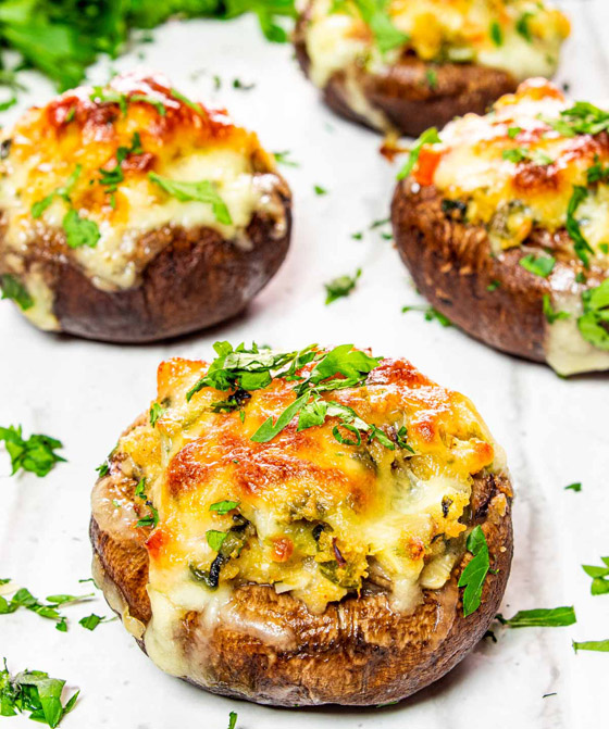يتم تحضير هذا العشاء النباتي اللذيذ في 30 دقيقة فقط، لذا فهو مثالي في ليالي الأسبوع المزدحمة. يتم حشو الفطر باللحم مع الزعتر العطري والثوم، ثم يتم تغطيته بفتات الخبز والجبن ويتم شواؤه حتى يصبح لونه ذهبيًا. يمكن تناوله مع سلطة حارة وخبز الثوم للحصول على عشاء لن يخيب الظن...