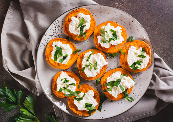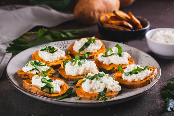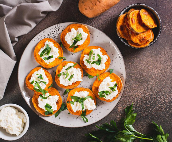 البطاطا الحلوة بجبن الماعز لمقبلات شهية... حضروا طبق مقبلات جانبي لذيذ ومغذي من الأطباق الشهية المعدة بالبطاطا الحلوة الغنية بالألياف والفيتامينات والمعادن، وجبن الماعز كمصدر جيد للبروتين والكالسيوم. طبق سهل التحضير ويحتوي على عناصر غذائية متعددة، جربوه على طريقتنا، وبالصحة والعافية. وقت الطهي: 60 دقيقة.. يكفي ل: 3 أشخاص.