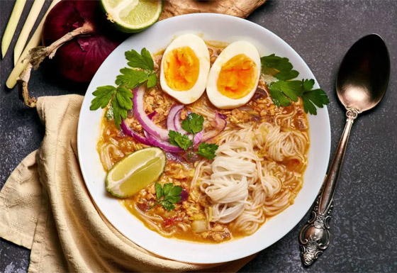 يُشكّل جزءًا أساسيًا من وجبة الفطور في غالبية أنحاء ميانمار، حيث يوزع الباعة أطباقًا ساخنة من الحساء على الأرصفة وفي محلات الشاي. ويتفرّد قوامه بشكل خاص بالمرق العطري الذي يغلي مع الأعشاب، ويٌكثَّف بمسحوق الأرز المحمص.