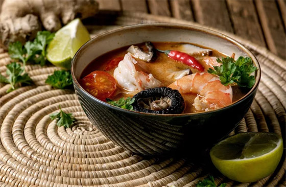 يُعد مرق هذا الحساء الحلو، والحامض، والحار، والمالح، مثاليًا للروبيان الحلو الطري. وتشمل مُكوّناته كلًا من الخولنجان، وعشبة الليمون، وأوراق الليمون، بينما يمنحه الفلفل الأحمر مذاقًا حارًّا إضافيًا.