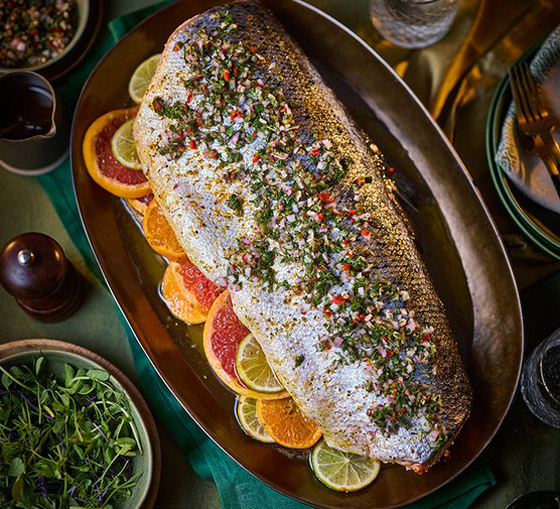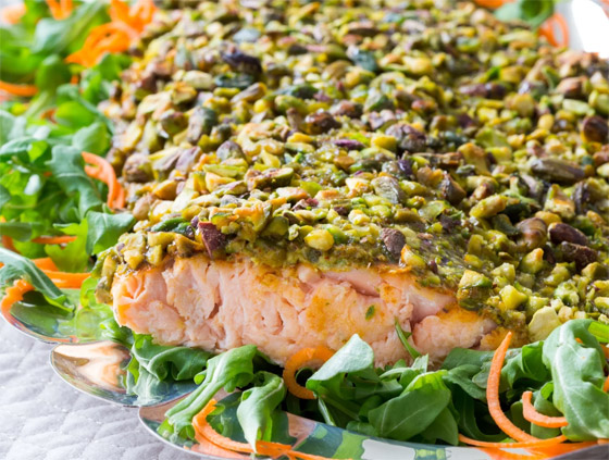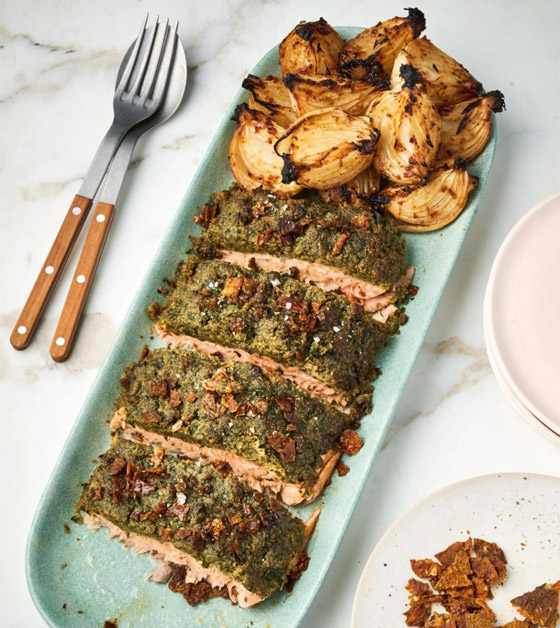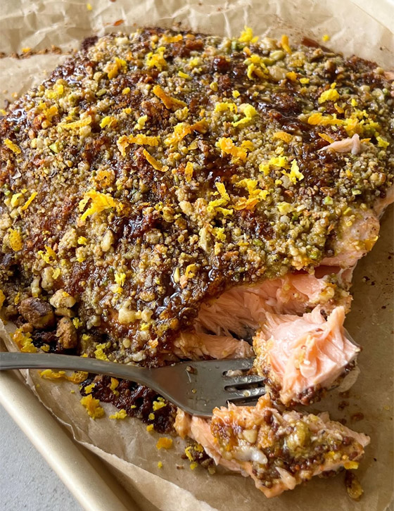 سمك السلمون المحشو بالحمضيات.. نكهات الحشو الكلاسيكية، والكليمنتين الحلوة، والفستق المقرمش، تخلق قشرة لذيذة لهذه الوصفة البسيطة والمميزة لسمك السلمون المحمّص. إنها وليمة رائعة للفم والعينين على مائدة عيد الميلاد أو رأس السنة.