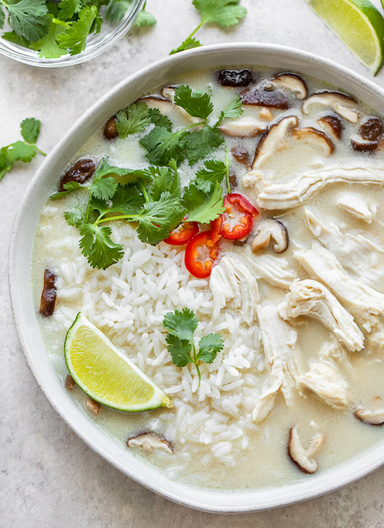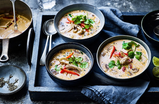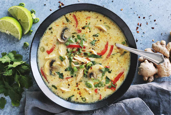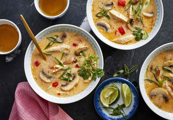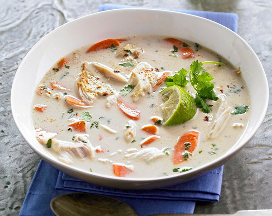 حساء الدجاج بجوز الهند... لذة التناقض.. يمكن تحويل بقايا الدجاج المشوي إلى حساء لذيذ، مع حليب جوز الهند الكريمي، وقليل من التوابل، والكثير من الخضار. تُعدّ هذه الوصفة السهلة للحساء طبقاً دافئاً مثالياً لفصل الشتاء، وتجمع لذة التناقض بين الحلو والمالح.